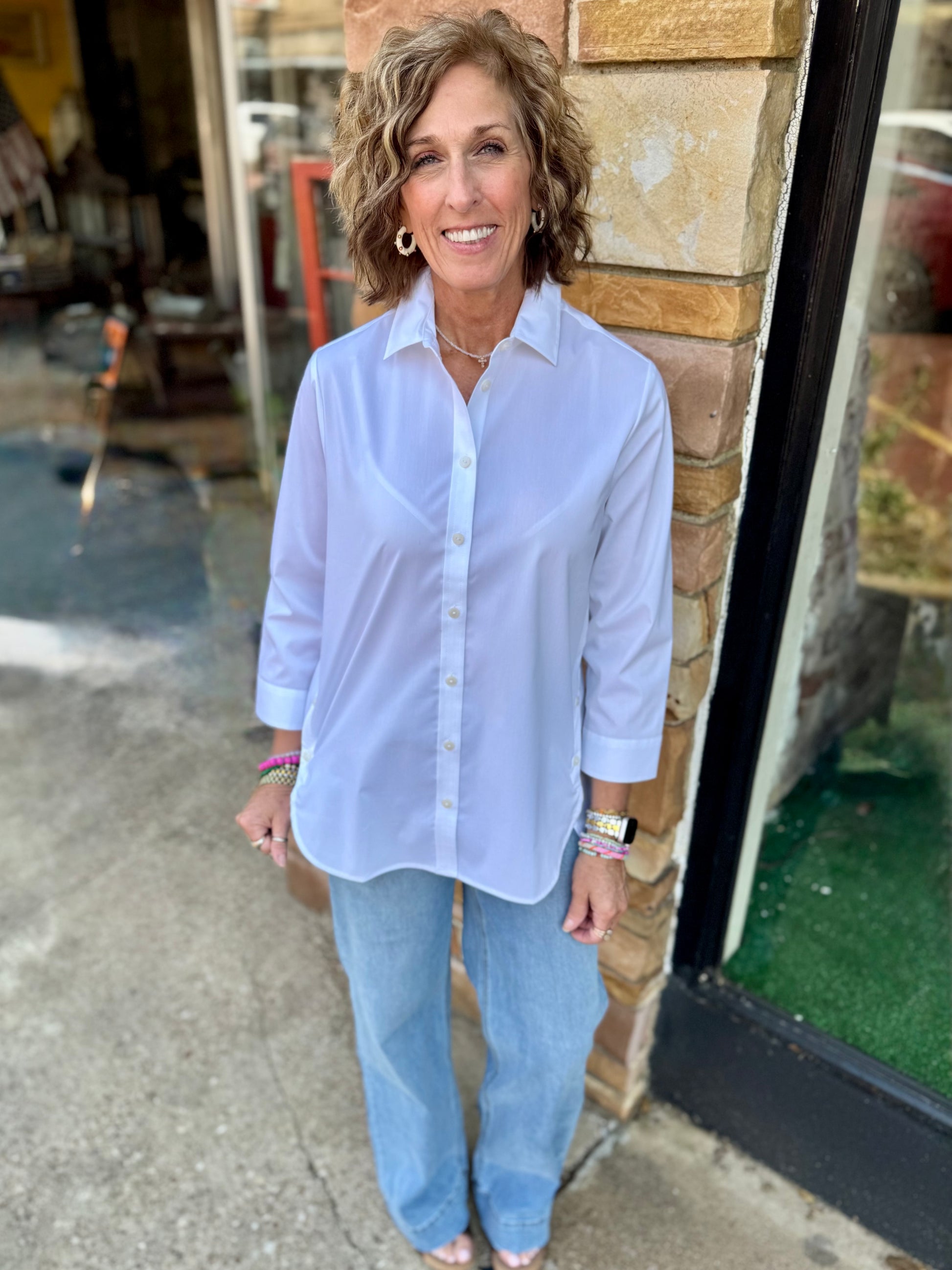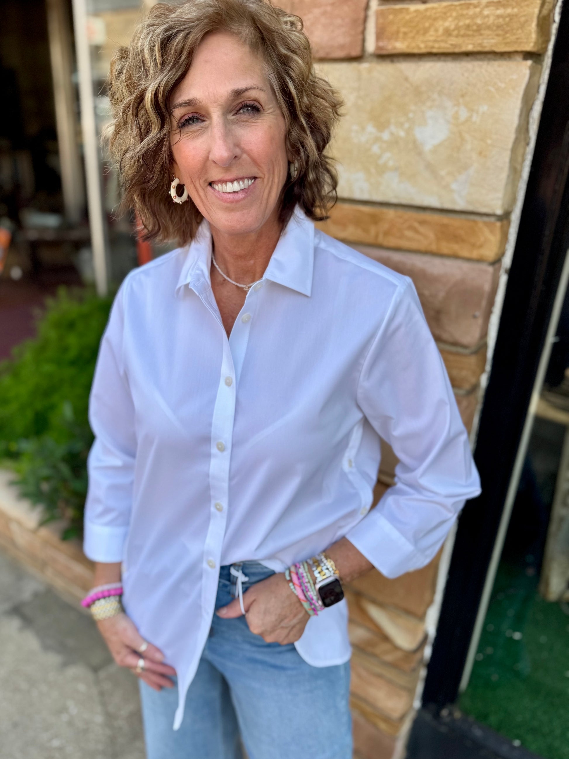 Elevate your wardrobe with this elegant white button-up shirt, featuring a classic collar and refined button side details. Its crisp design offers a sophisticated look perfect for formal occasions or stylish everyday wear. Crafted to provide a polished silhouette, this piece seamlessly blends timeless style with subtle modern accents.