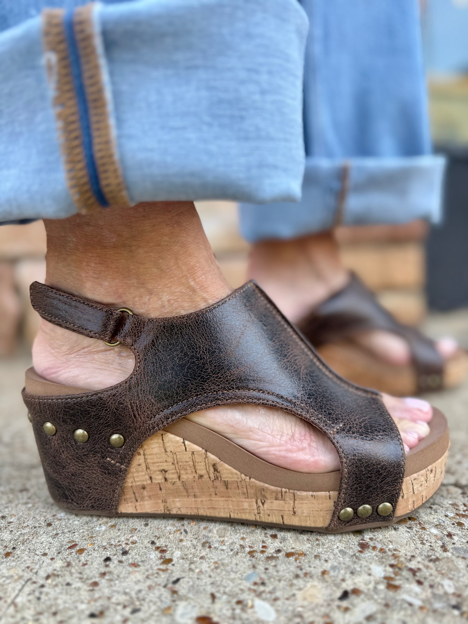 Make a fearless statement this fall with the Carley Espresso Corkys. Crafted from crinkle vegan leather, these wedges combine edgy style with all-day comfort. Their bold texture and supportive design ensure you stand out while staying comfortable through every step of your autumn adventures.