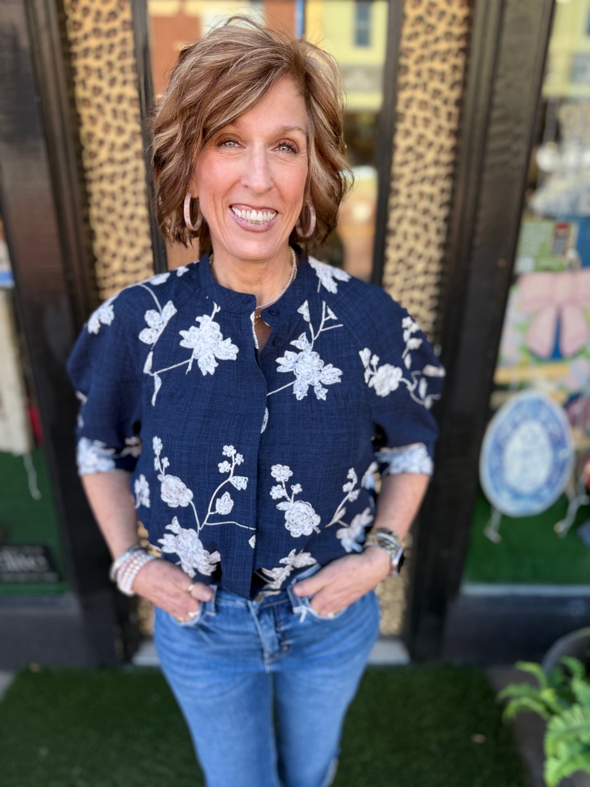 Elevate your wardrobe with this refined floral embroidered button-down top, featuring an elegant covered placket for a polished finish. The intricate floral detailing adds a touch of artisanal charm while maintaining a sophisticated silhouette perfect for both professional and casual settings. Crafted with attention to detail, this versatile piece transitions seamlessly from office to weekend wear, offering timeless style with contemporary flair.