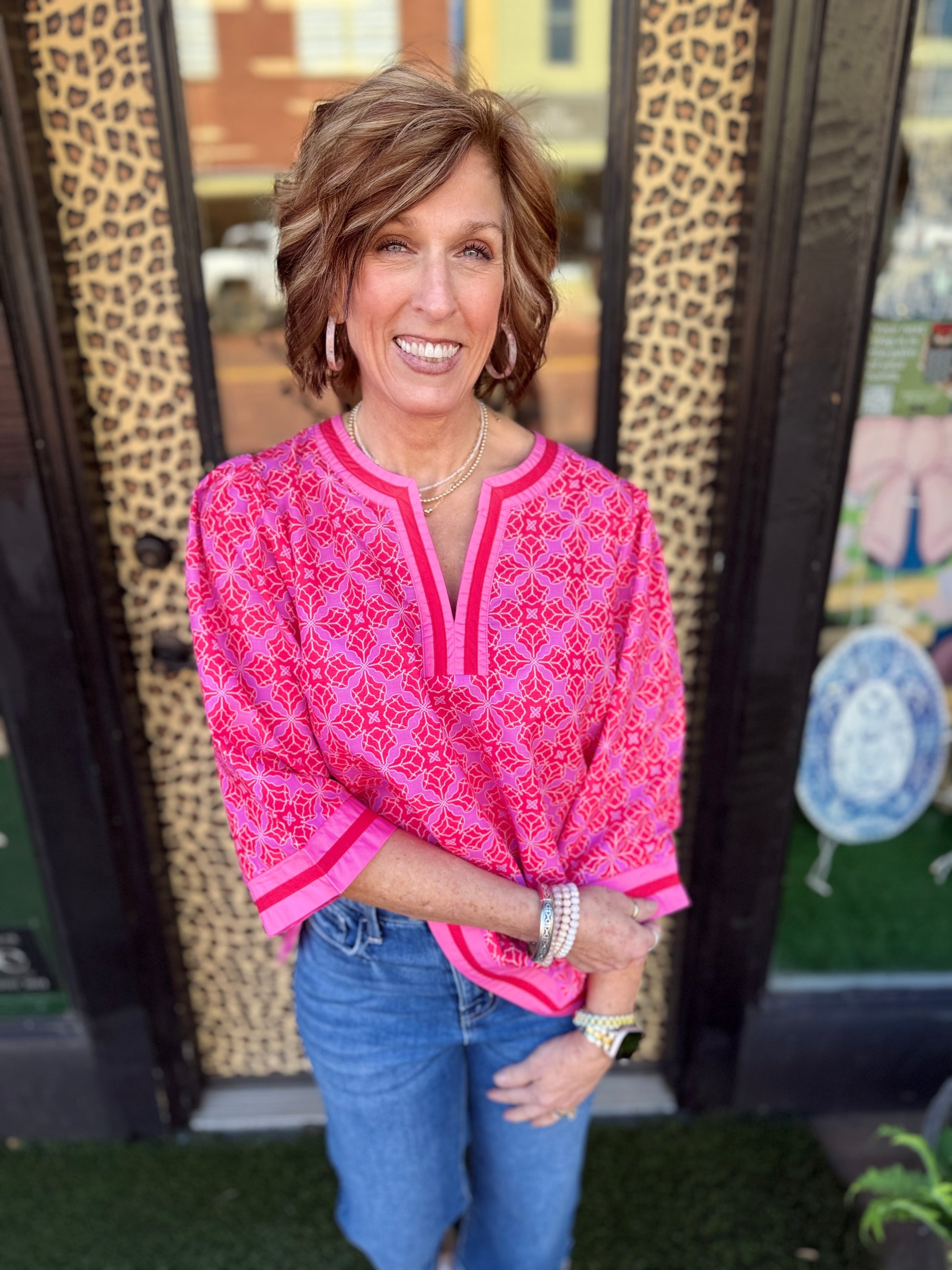 The Escape Top combines effortless elegance with thoughtful design details. This sophisticated piece features a striking medallion pattern throughout, complemented by rich color contrast accents that add visual interest. The three-quarter sleeves provide a refined silhouette, while the v-notched neckline creates a flattering frame. Practical side slits at the hem ensure comfortable movement and a modern edge. Perfect for layering or wearing solo, this versatile top transitions seamlessly from day to evening.