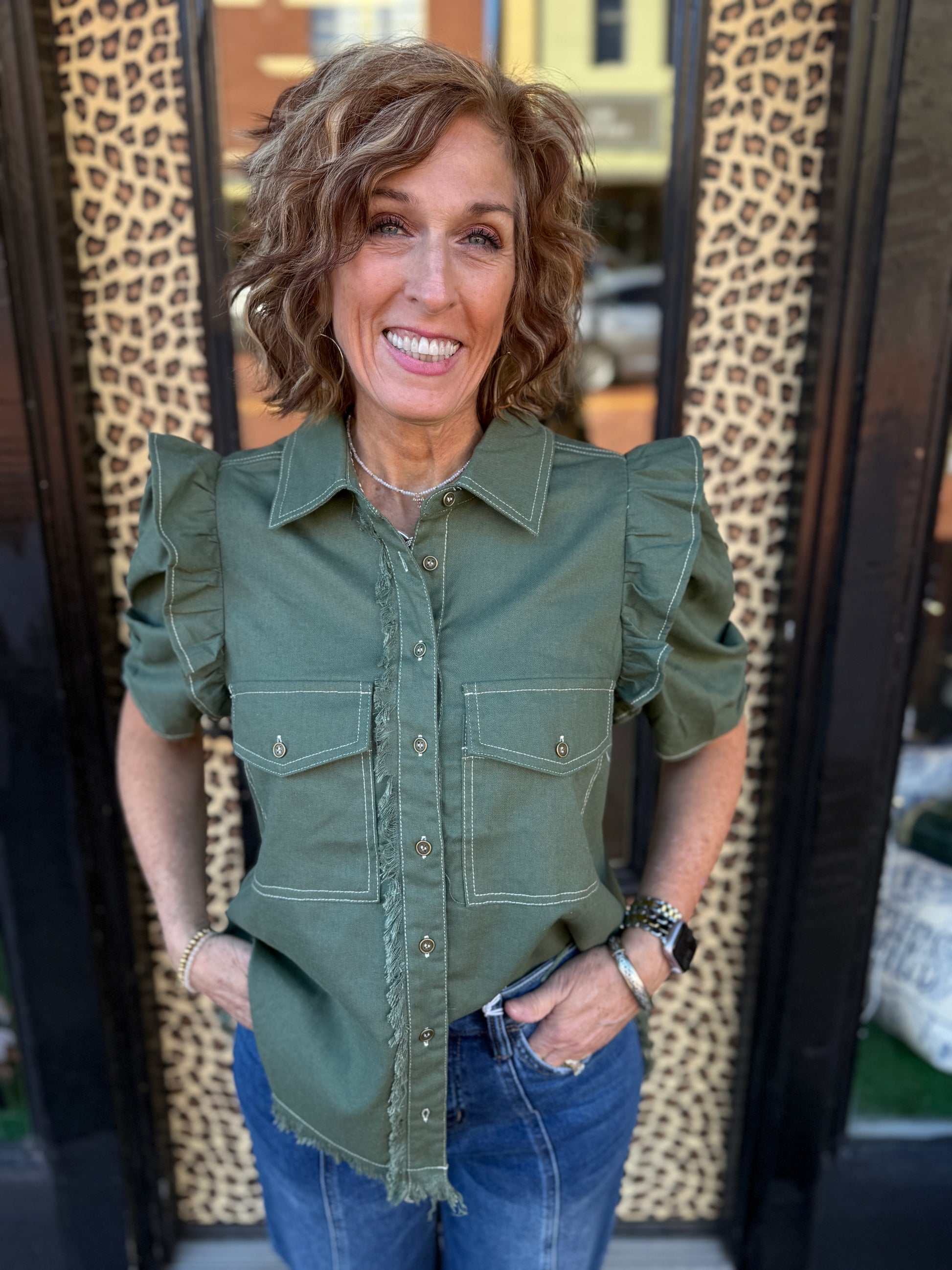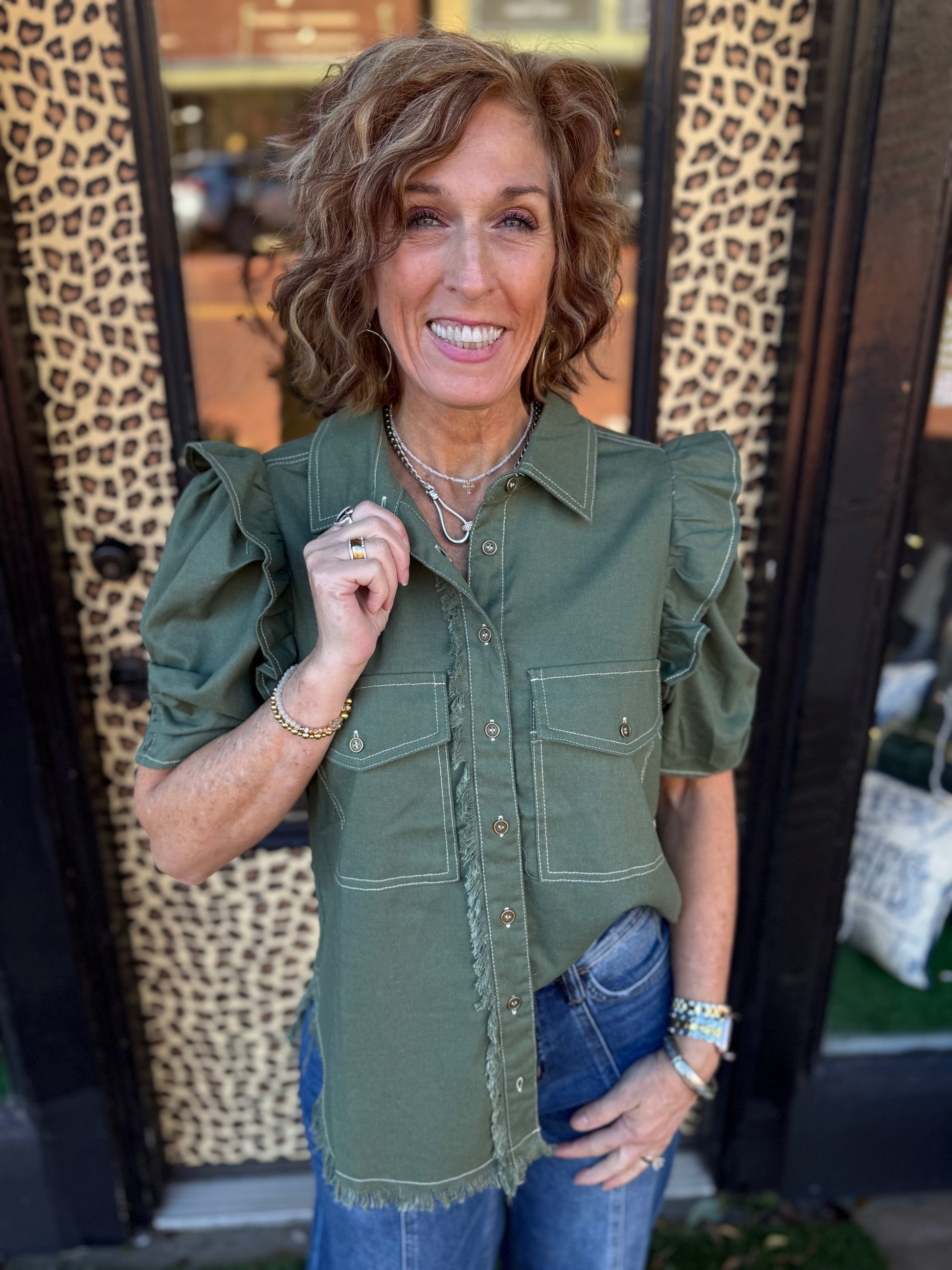 The Hallora Top is a refined linen button-up shirt that blends classic tailoring with delicate design touches. Featuring softly ruffled gathered sleeves, it adds subtle texture and movement, while the frayed hem details offer an understated edge. Lightweight and breathable, this top provides effortless elegance for both casual and polished ensembles.