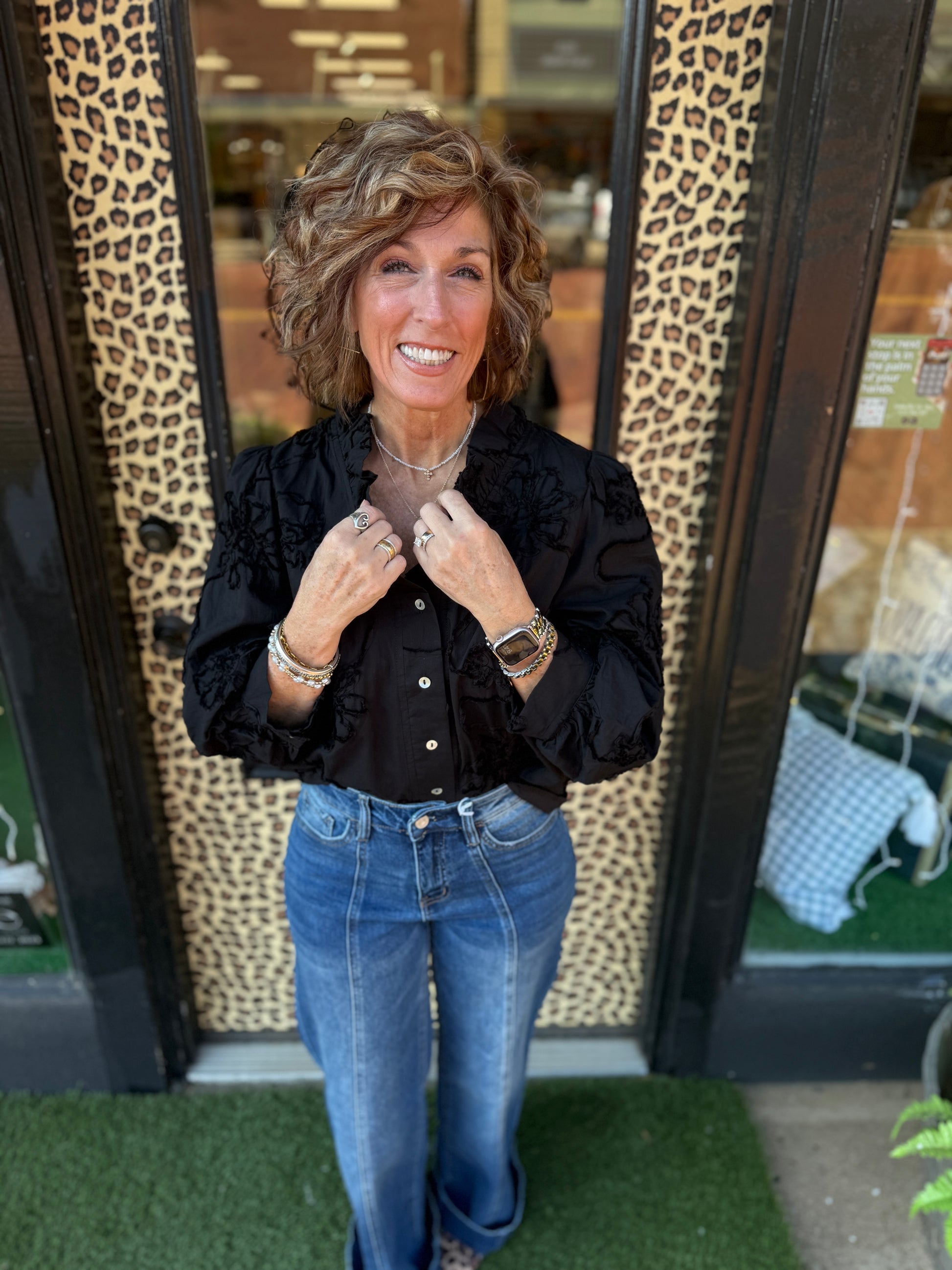 The Hamilton Top features a refined 3/4 sleeve design with a delicate ruffled neckline that adds an elegant touch. Crafted from 100% cotton with textured fabric and a subtle 3D floral pattern, this button-down blouse combines comfort with sophisticated style, perfect for elevating your everyday wardrobe.