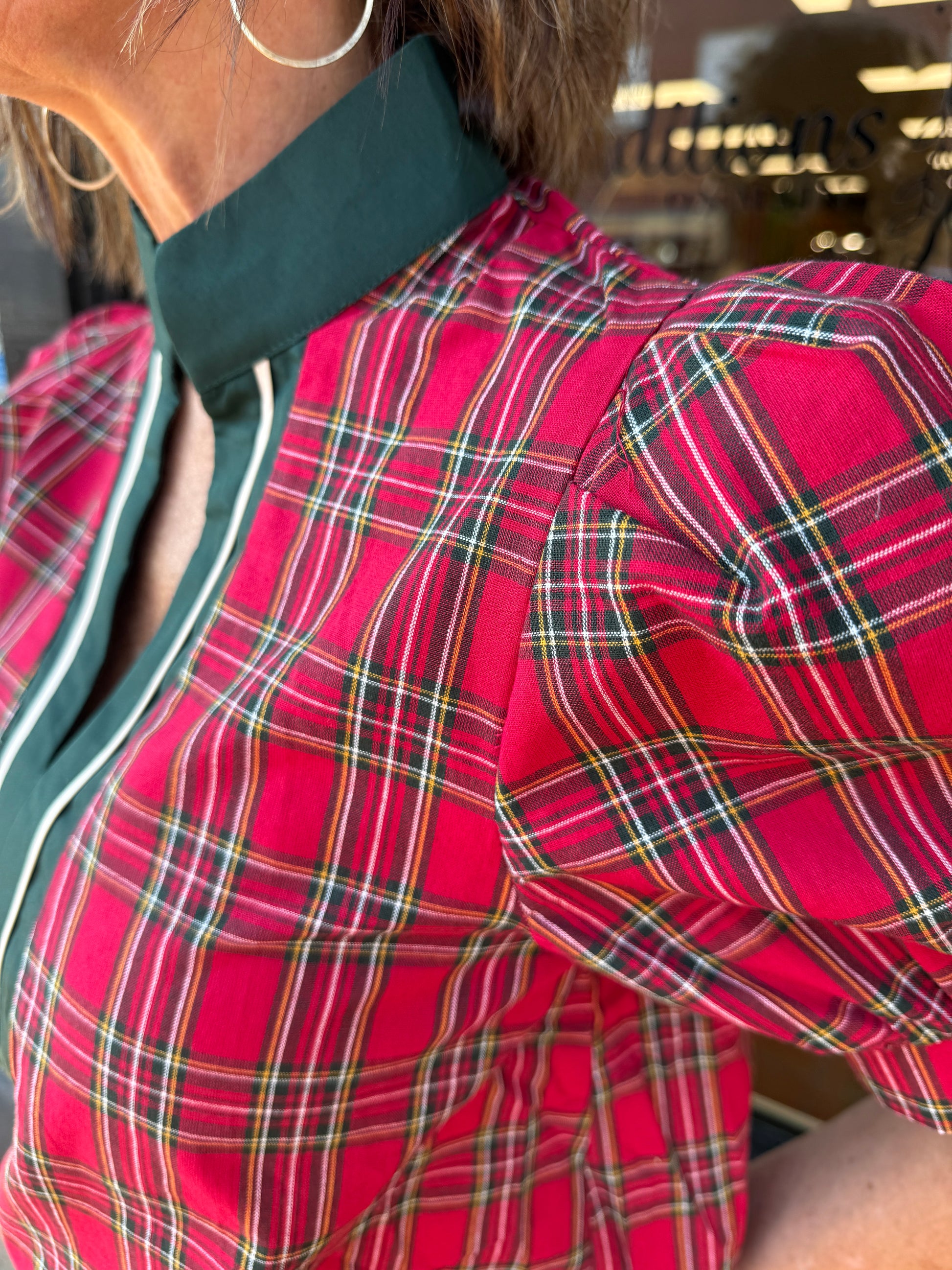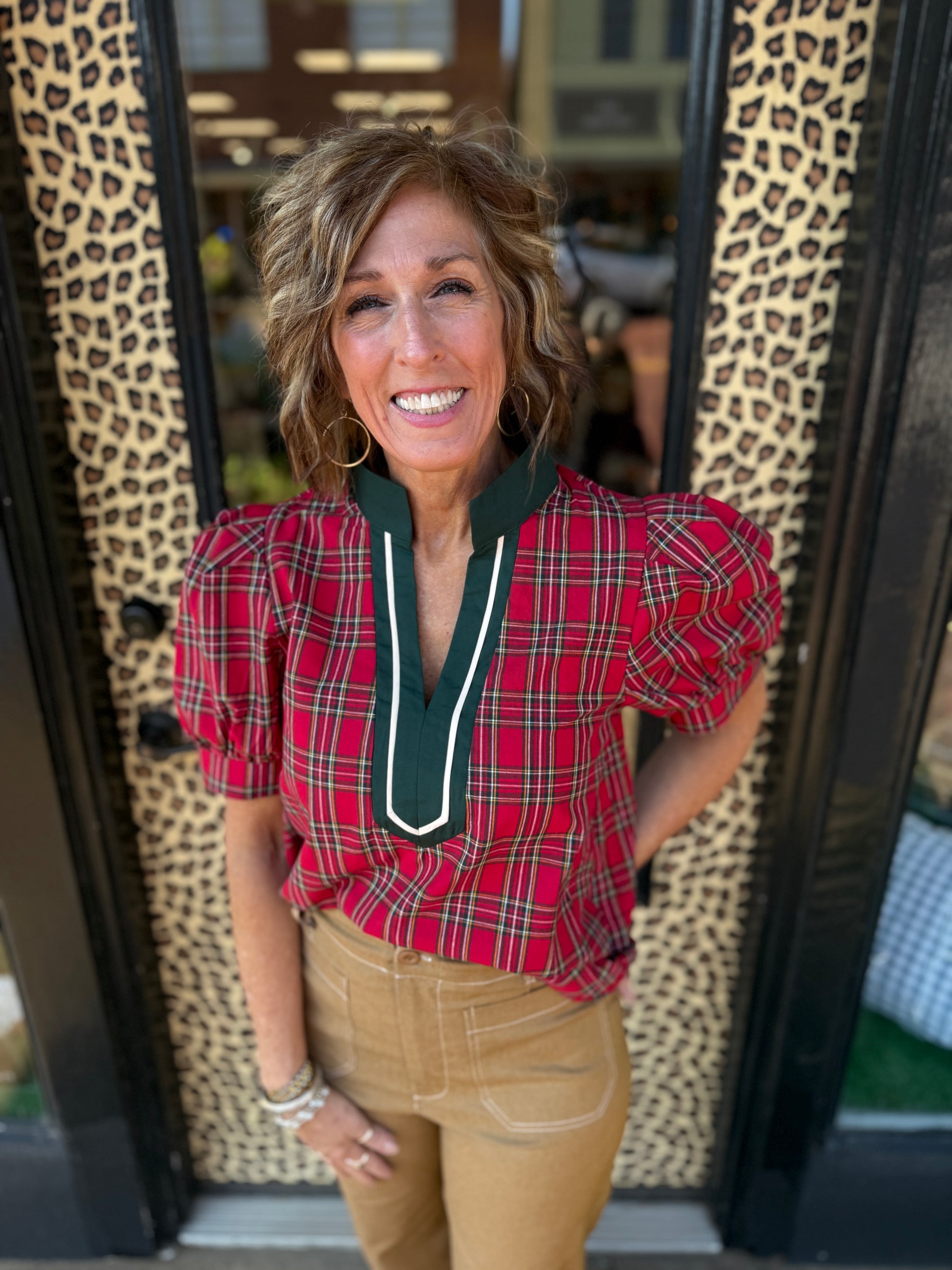 This short-sleeve top showcases a red plaid pattern with a sophisticated caftan-inspired V-neck band accented in contrast. Crafted from lightweight, 100% cotton woven fabric, it offers comfort without lining and remains non-sheer, perfect for a polished yet relaxed look.
