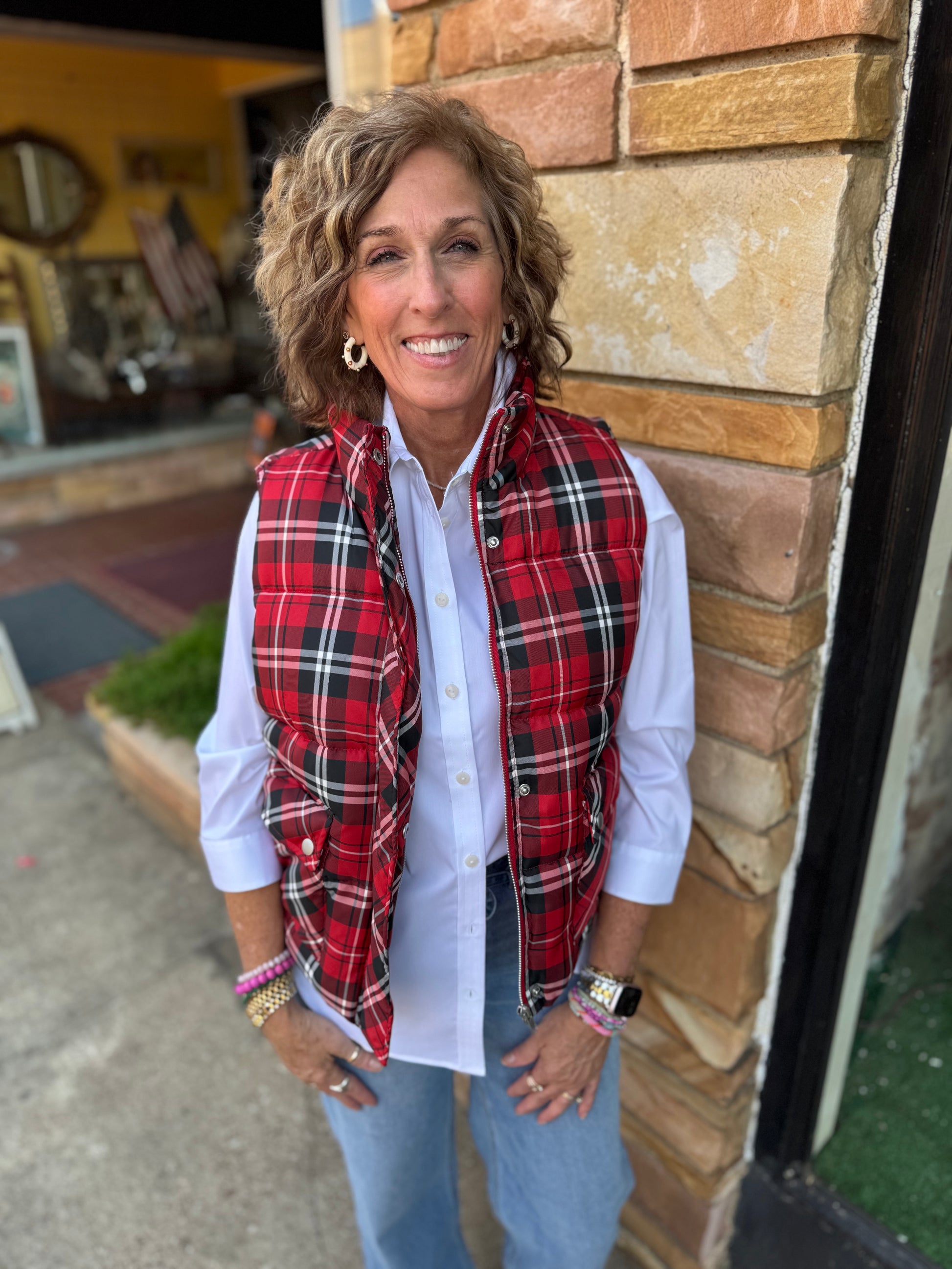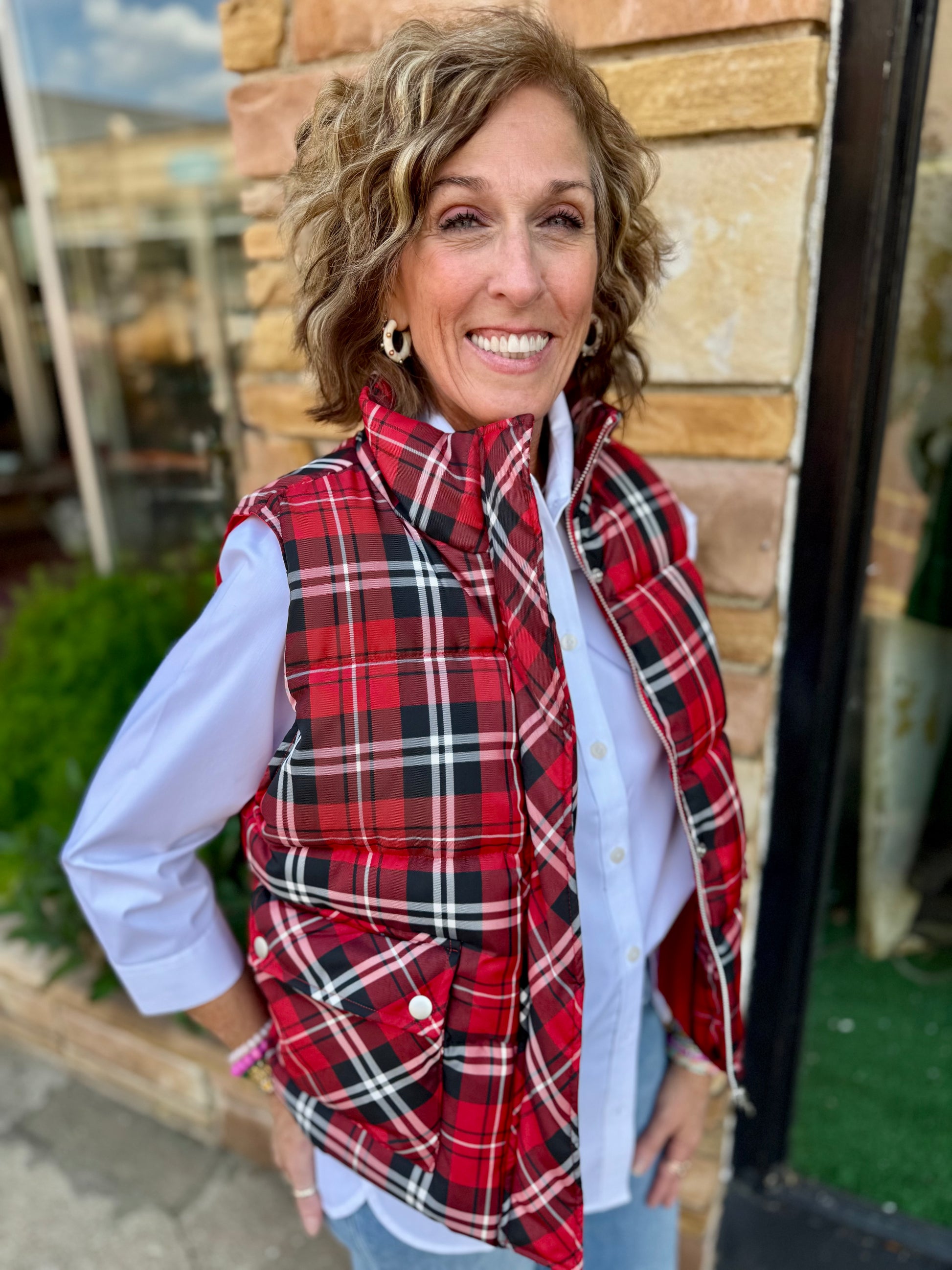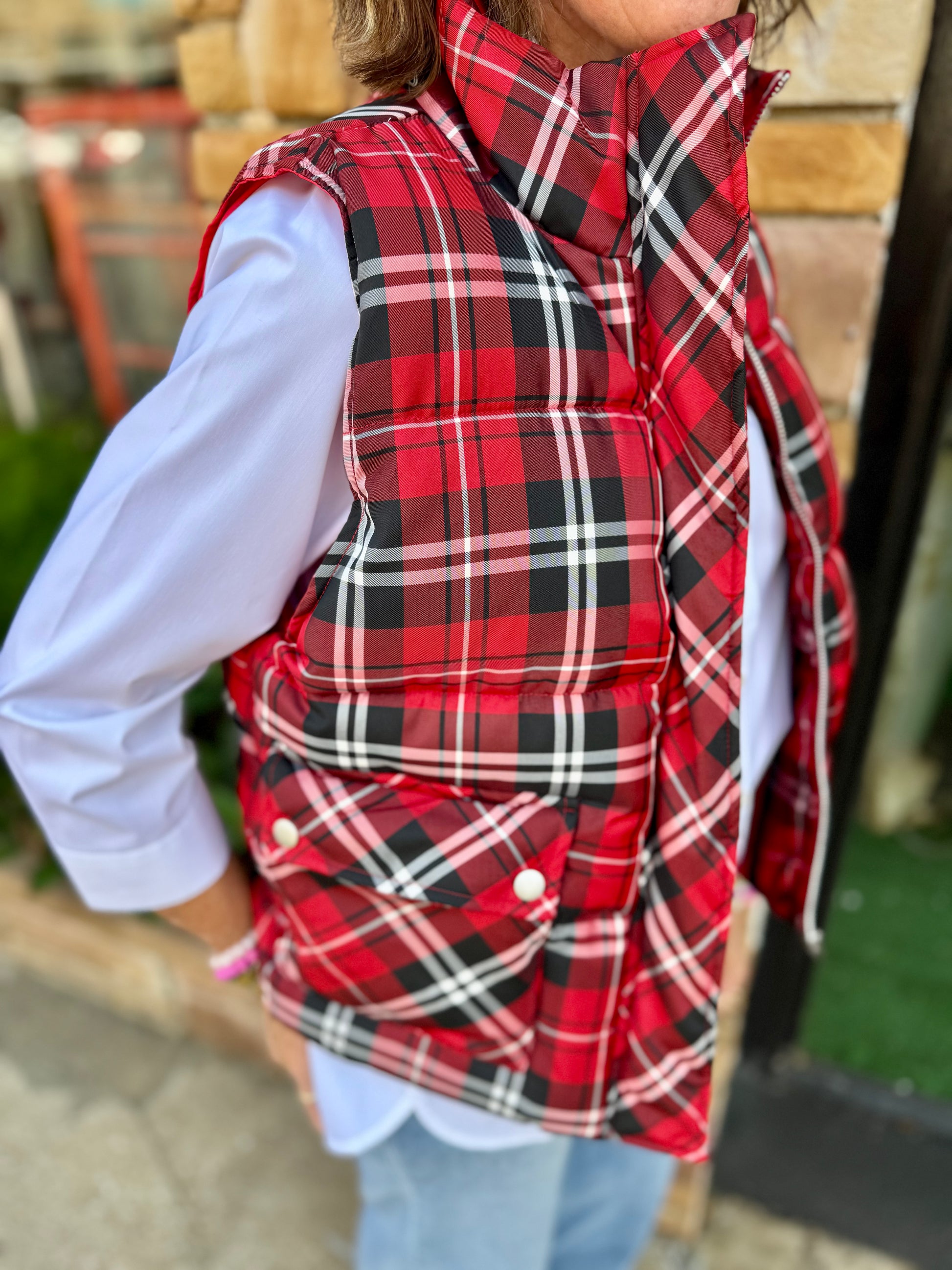 Make a bold statement with the Holiday Is On The Way Vest. Featuring a striking red, black, and white plaid pattern, this vest zips up for a sleek fit and includes buttoned front pockets for secure storage. The classic collar adds a sharp edge, perfect for layering with attitude on chilly days. Stand out and embrace the season with daring style.