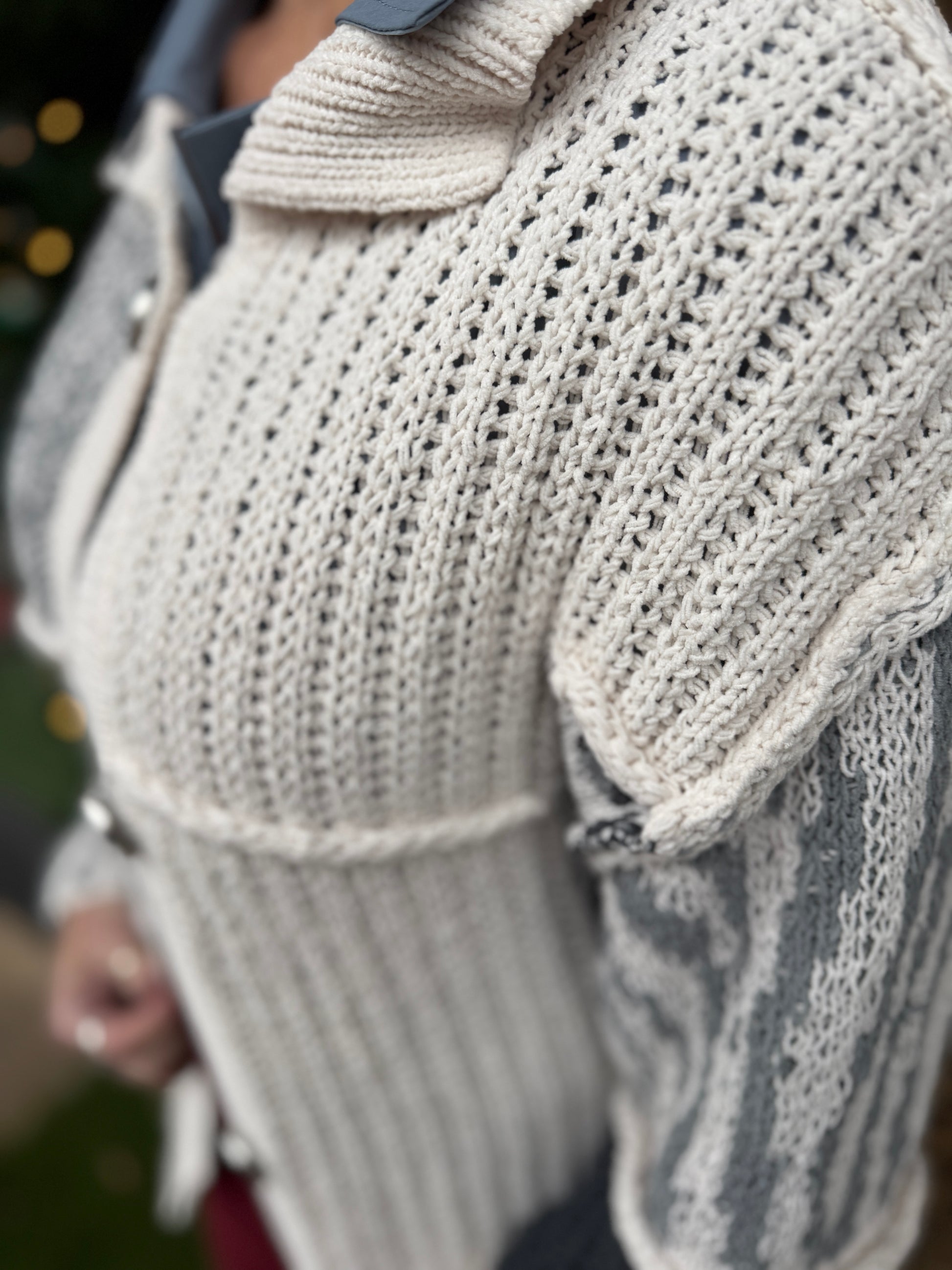Introducing the All The Way Around Cardigan- the perfect addition to any wardrobe. This stylish garment features a unique blend of gray and cream, alongside playful prints that will add a touch of fun to any outfit. Plus, the added collar provides an additional layer of warmth and style. Upgrade your wardrobe today!