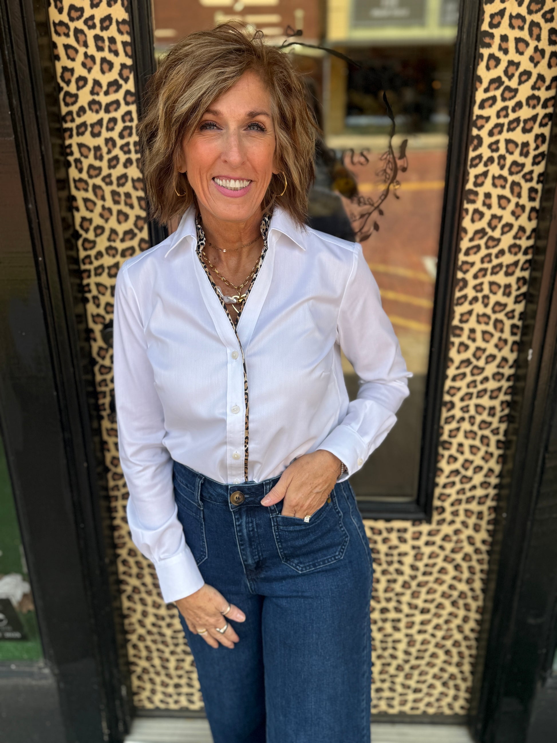 Marlee gets a fierce new twist. This timeless button-up keeps things crisp with sharp tailoring and a wide front placket — but look again. A cheetah-inspired print hides just beneath the surface, lining the collar and placket for a bold surprise. Button it up for contrast or pop the collar for a flash of pattern. Sleek, versatile and ready for anything.