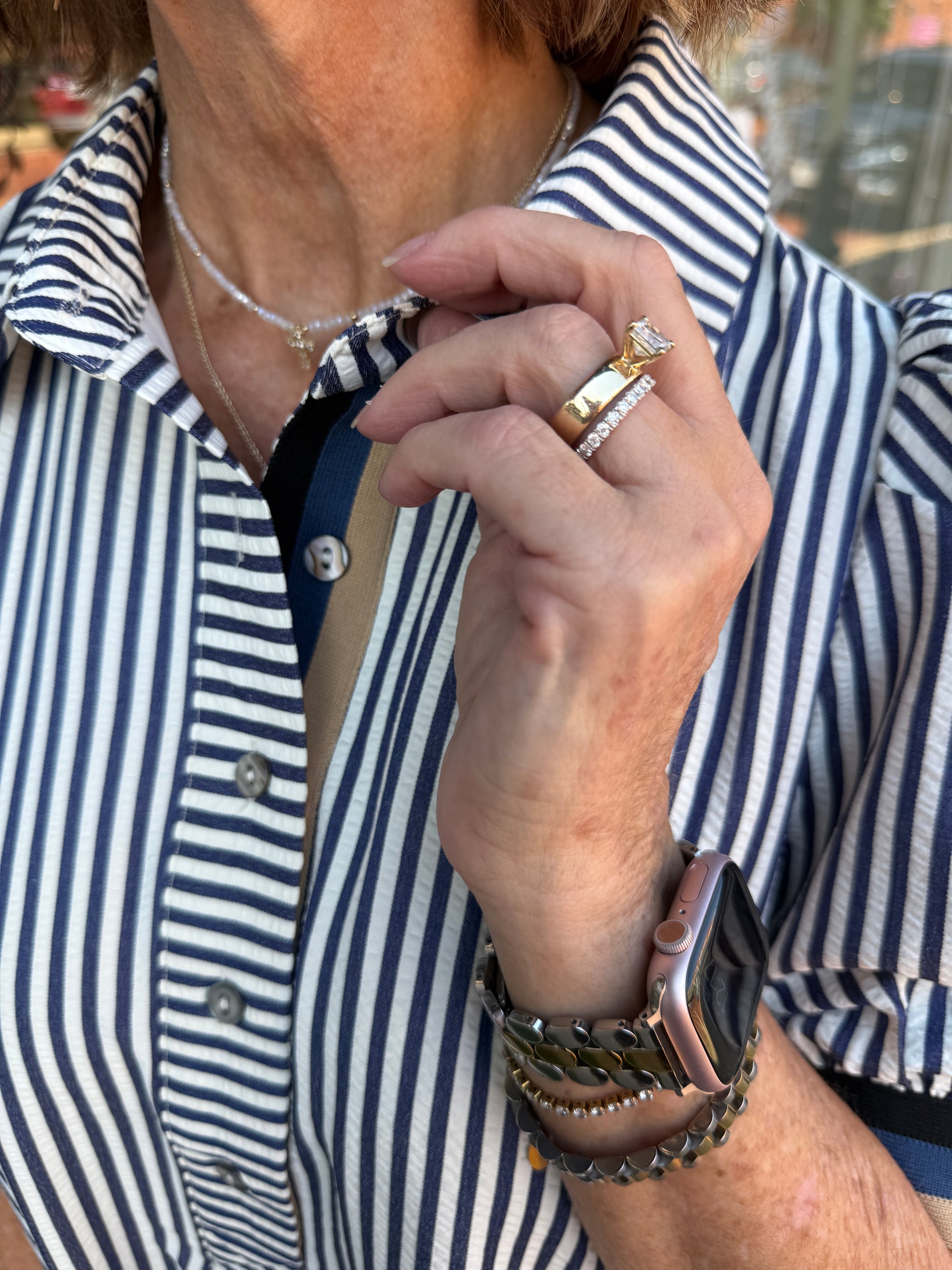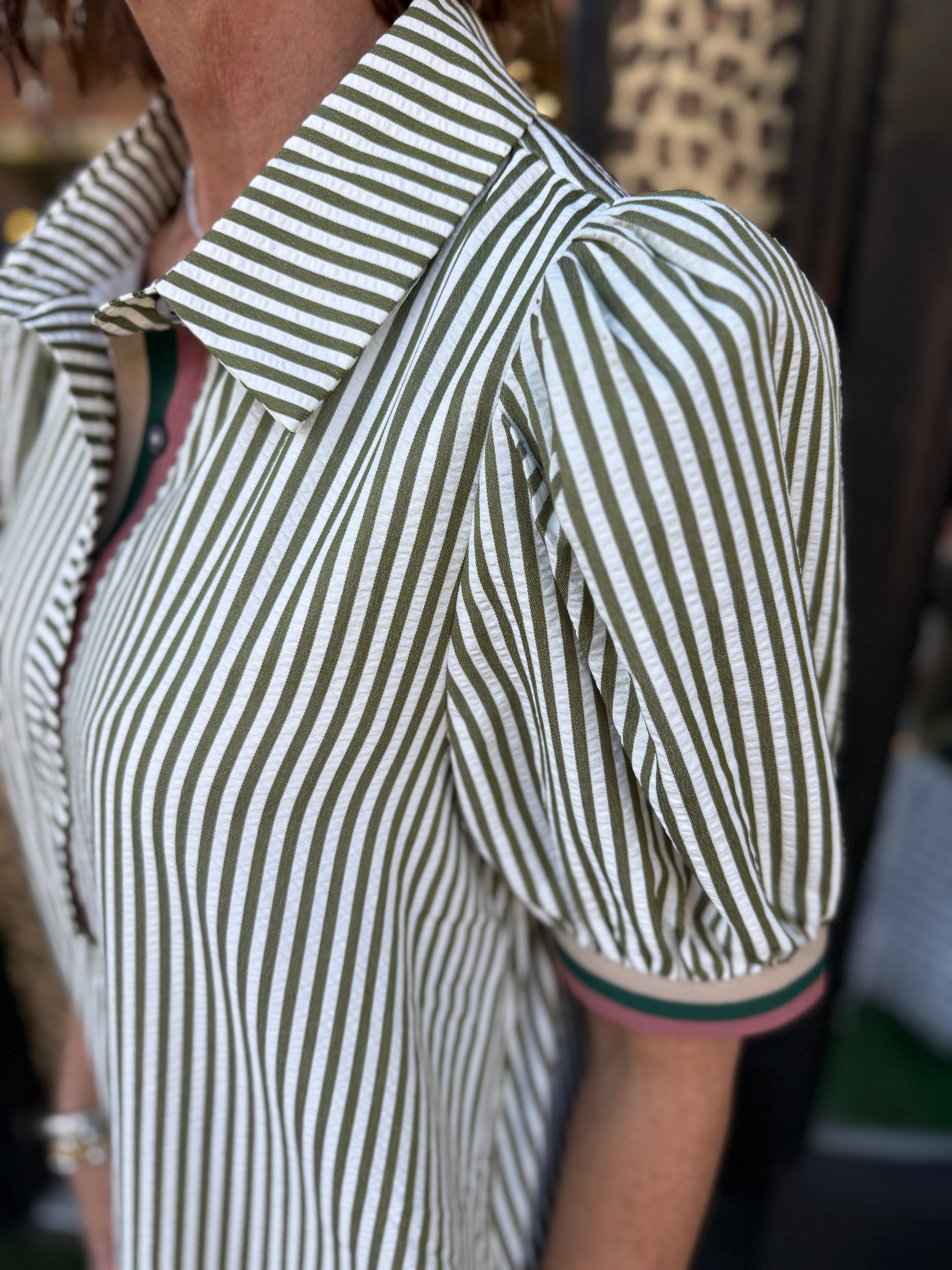 The Omella Dress features a refined stripe pattern with short puff sleeves and a flattering swing silhouette. Accented by a multicolor ribbed band and a classic collar with button closure, it offers subtle detailing that elevates its elegance. Crafted from a lightweight, woven fabric blend of polyester, rayon, and spandex, this lined dress ensures comfort without transparency. Perfect for sophisticated occasions, it effortlessly combines style and ease.