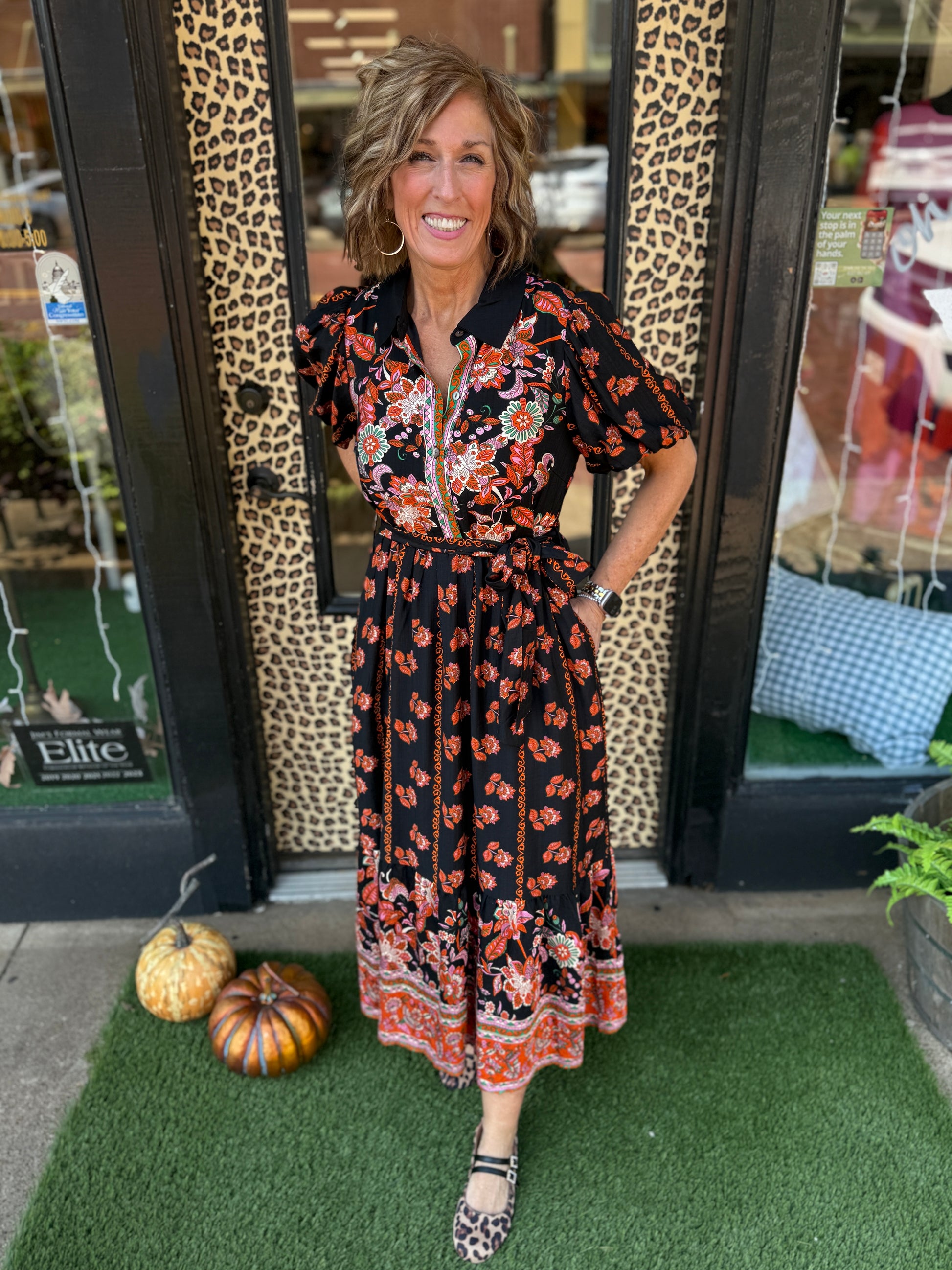 The Alabama Dress offers an elegant silhouette with its black botanical print and refined details. This midi-length woven dress features short puff sleeves, a shirt collar, and a pleated bodice that adds subtle texture. The contrast trim along the front button closure enhances its sophisticated look, while the elasticated waist with an adjustable tie ensures a flattering fit. Complete with side pockets and a lightweight, lined fabric that is both comfortable and non-sheer, this dress blends timeless style with modern ease. Crafted from a blend of rayon and nylon.