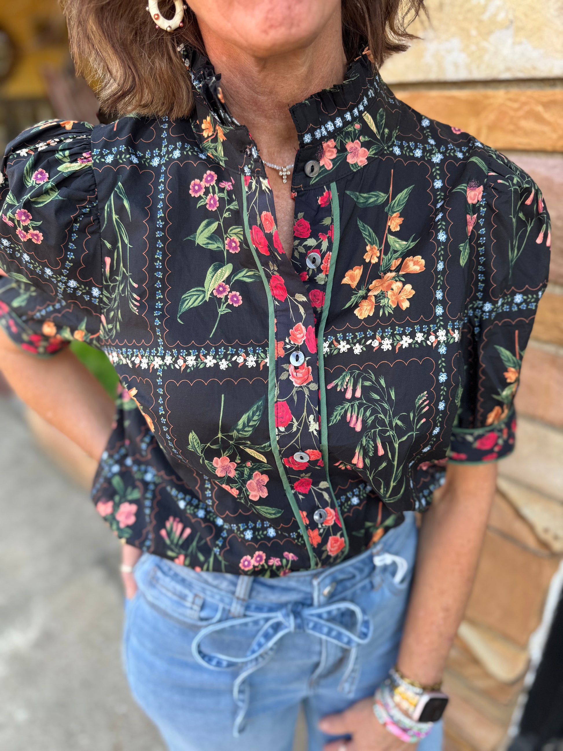 Add a touch of whimsy to your wardrobe with The Betsy Black Top. Featuring a charming black floral garden print and a playful ruffle neckline, this top brings a fresh, flirty vibe to any outfit. Perfect for sunny days or casual evenings, it’s a fun way to brighten your look with effortless style.