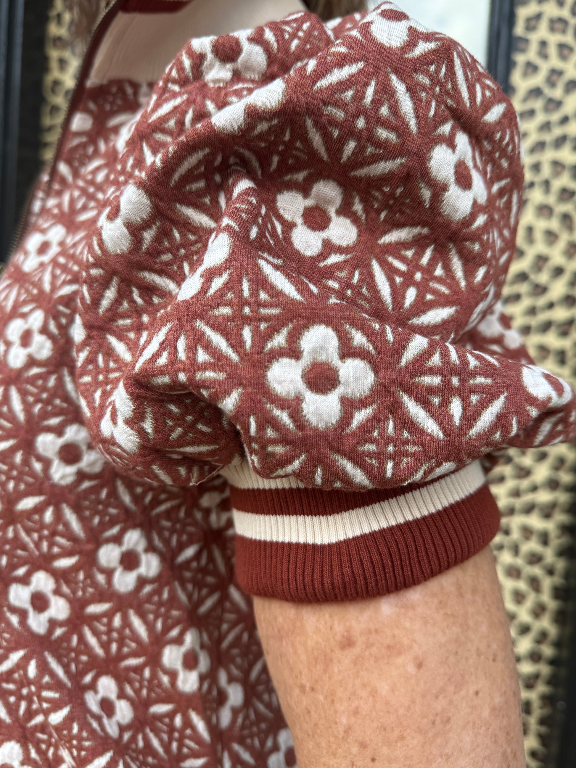 The Callie Dress offers a refined blend of comfort and style with its floral textured knit fabric. This short puff sleeve mini dress features a half-zip front, ribbed collar and cuffs, and convenient side pockets. Crafted from a medium-weight, non-sheer blend of polyester, rayon, cotton, and spandex, it provides a polished silhouette without compromising ease of wear. The unlined design enhances its lightweight feel, making it an elegant choice for various occasions.