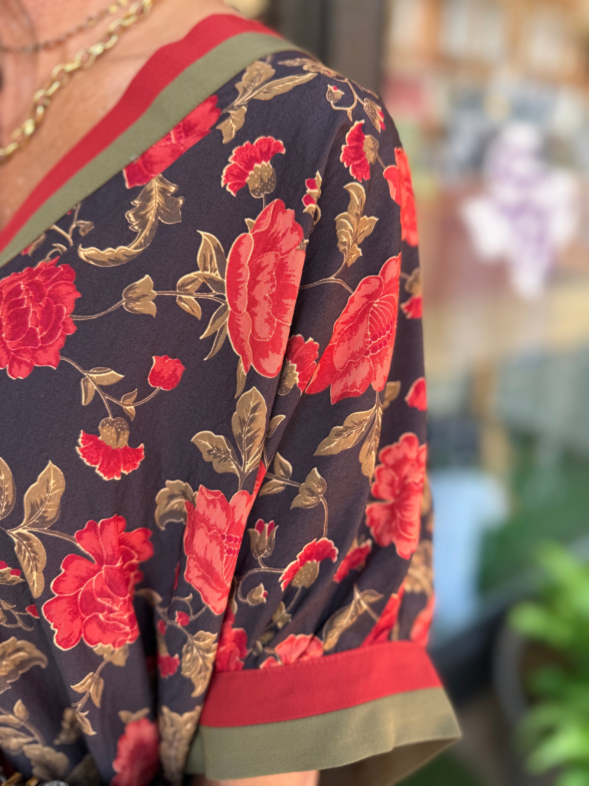 The Denver Top showcases a refined floral print complemented by a contrasting V-neck and hem panel, creating an elegant silhouette. Crafted from a lightweight, woven fabric blend of 90% rayon and 10% nylon, it offers a comfortable, non-sheer fit without lining, perfect for sophisticated layering or warm-weather wear.