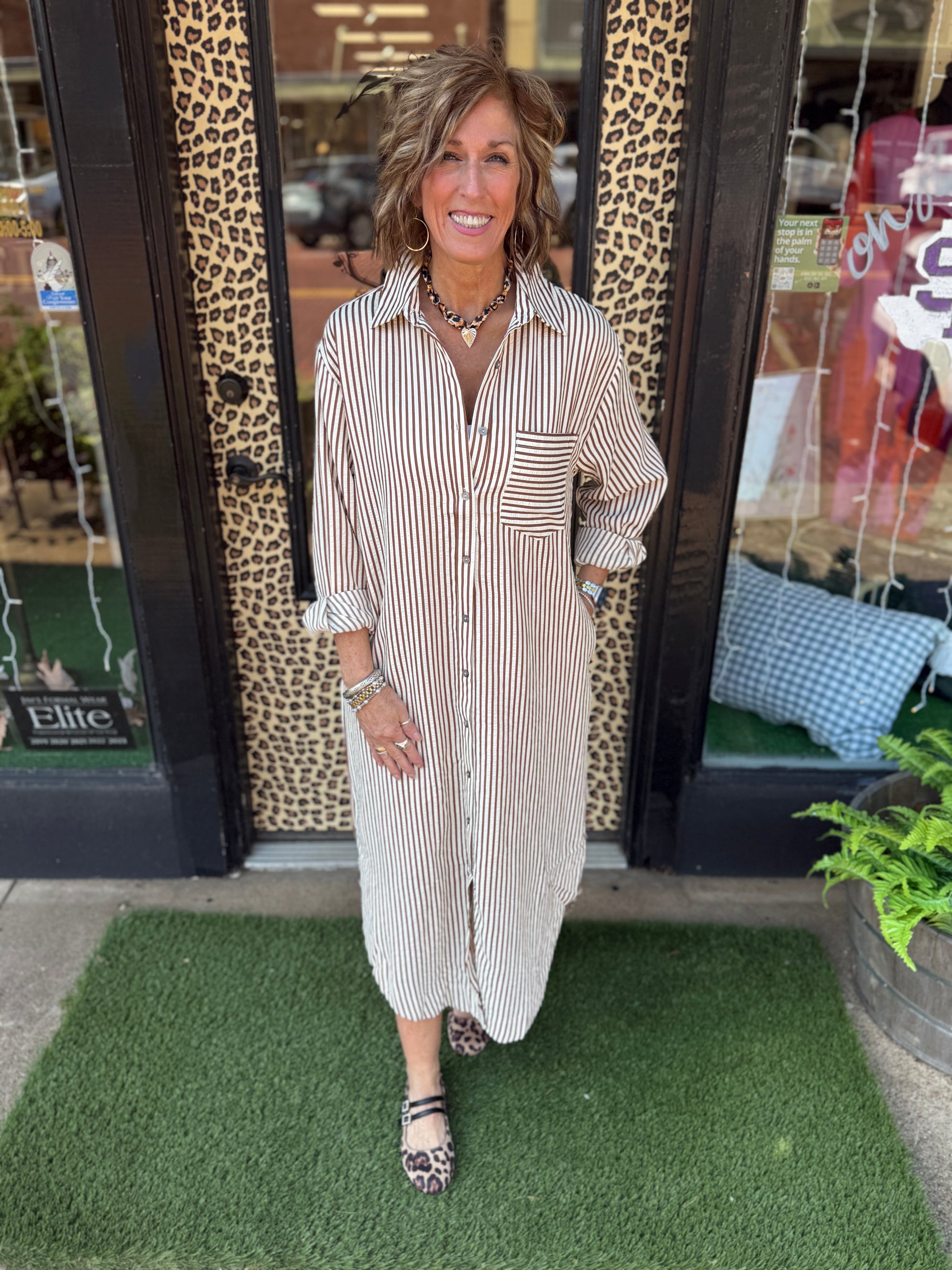 The Everly Dress is a refined midi shirt dress featuring a camel textured stripe pattern and a sleek rounded slit hem. Designed with discreet side pockets and crafted from lightweight, woven 100% polyester fabric, it offers comfort without compromising style. Unlined and non-sheer, this dress delivers an effortless, elegant look perfect for transitional seasons or polished everyday wear.