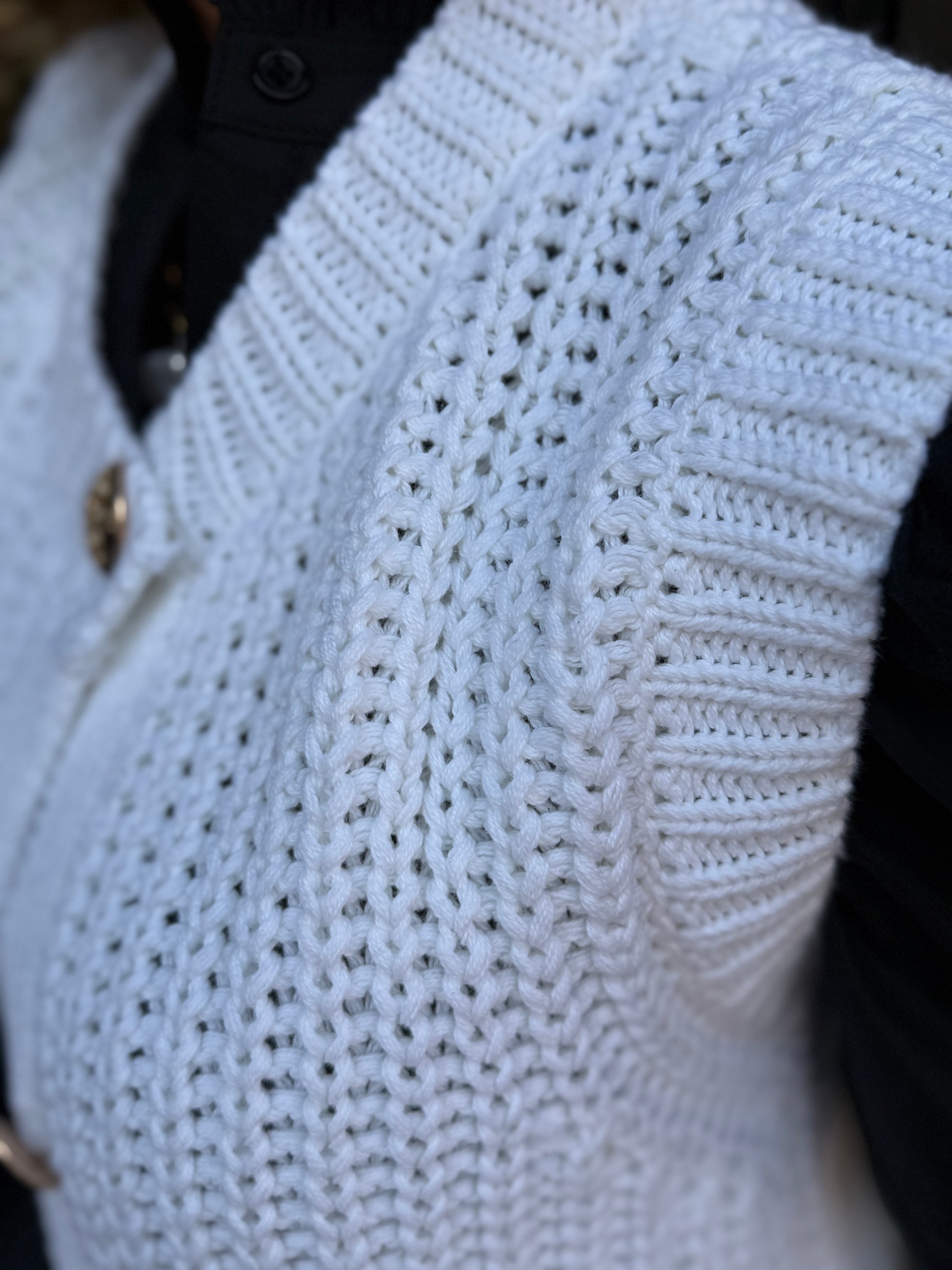 The Jennifer Vest offers a sophisticated take on cozy elegance with its off-white hue and button-down design. Crafted for comfort, this sweater vest features convenient pockets for added practicality, making it a versatile layering piece that seamlessly complements any refined wardrobe.