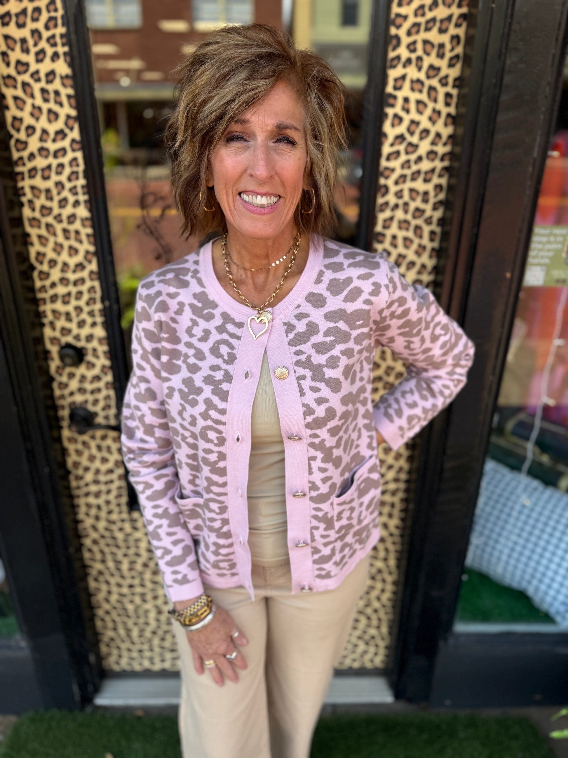 Elevate your wardrobe with The Kathryn Cardigan, a refined leopard-print button-down sweater featuring long sleeves and convenient pockets. Crafted from a luxuriously soft blend of 50% viscose, 30% polyester, and 20% nylon, it offers exceptional comfort and durability. Perfect for layering, this sophisticated cardigan adds a touch of timeless elegance to any outfit.