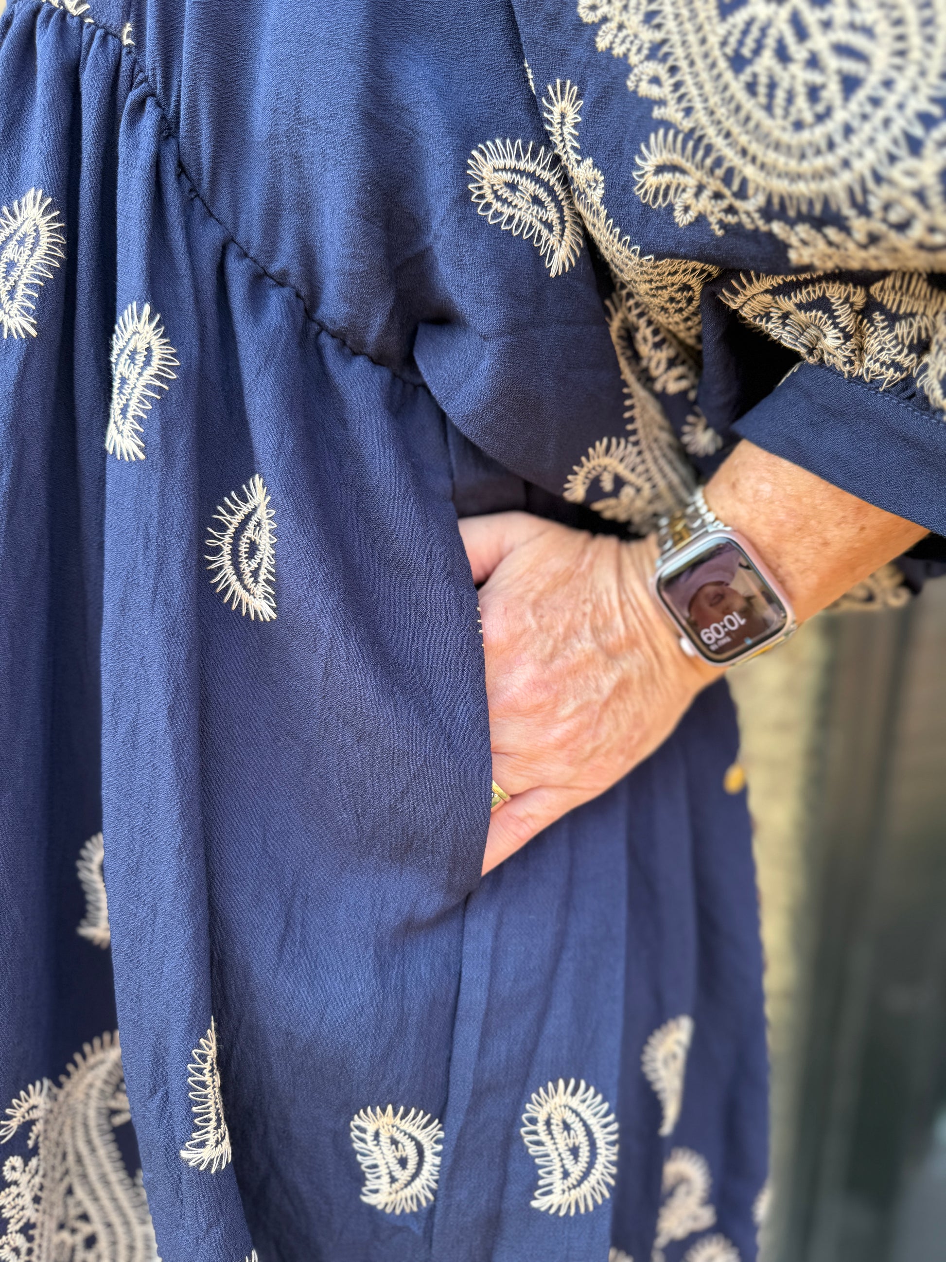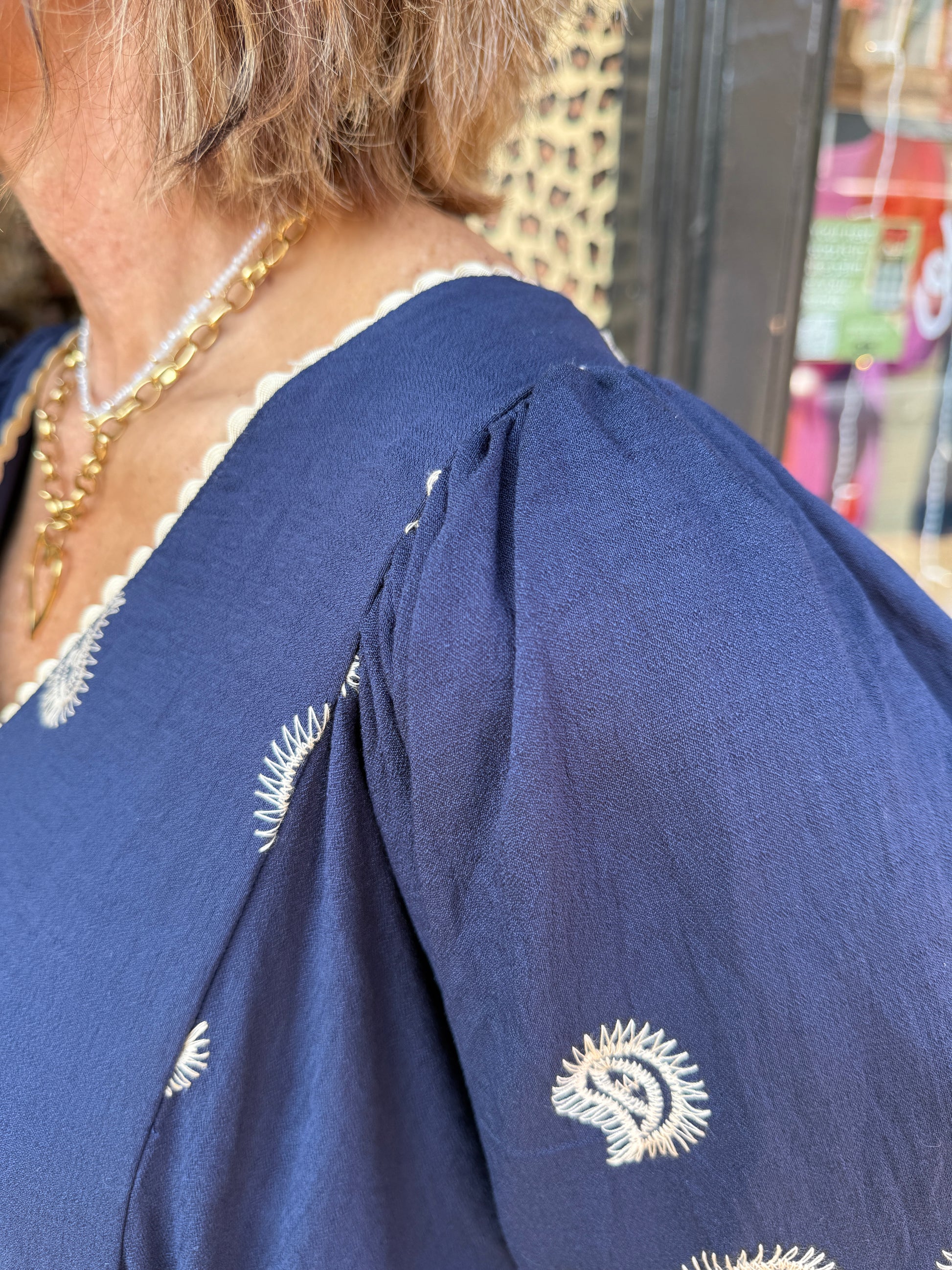 Discover the timeless beauty of The Kimberly Dress. This mini dress features stunning navy paisley embroidery and elegant puff sleeves. Made with a blend of 75% rayon and 25% nylon, it offers a comfortable and flattering fit. Transform any occasion into a special one with this stylish and chic dress.