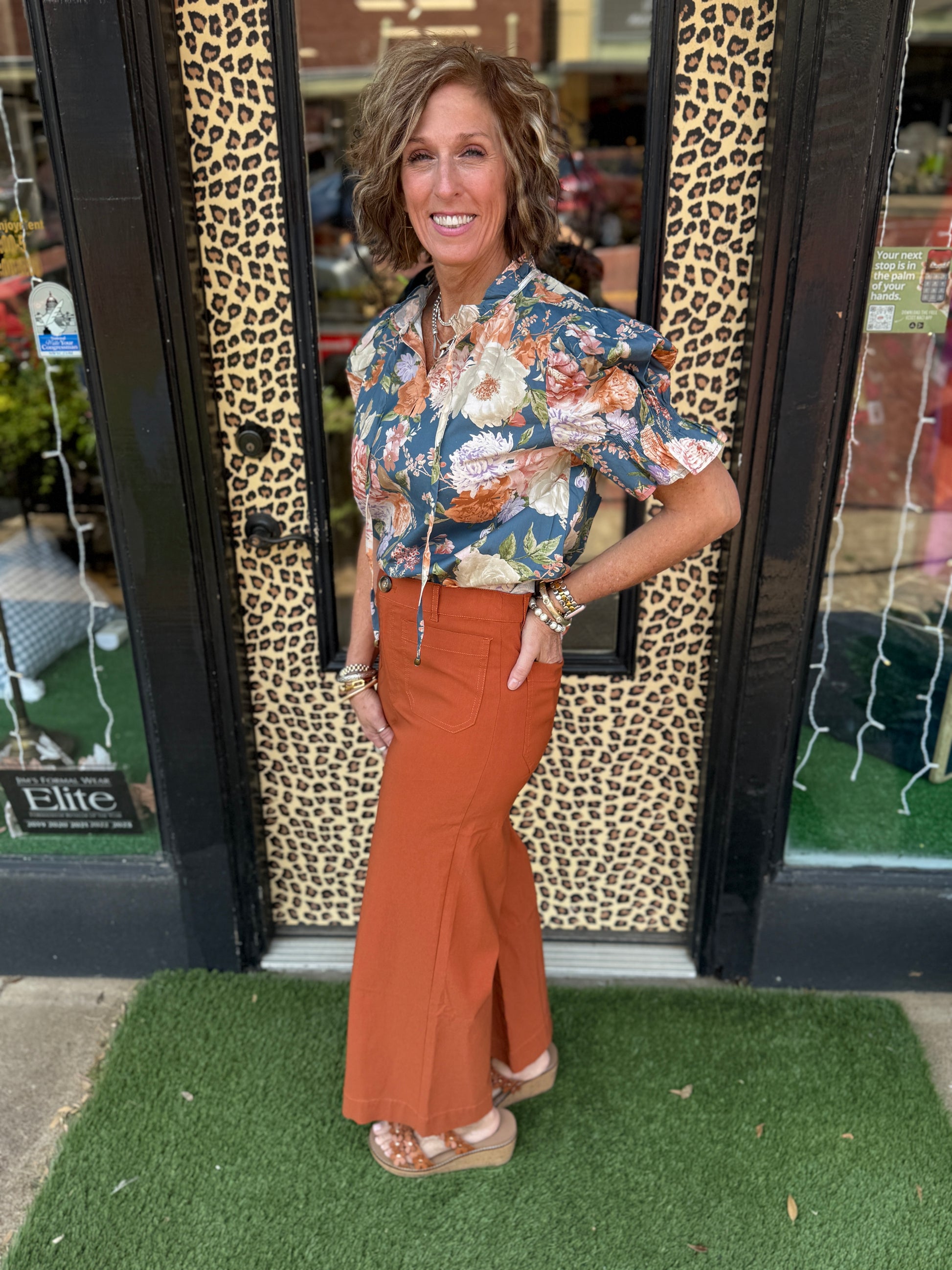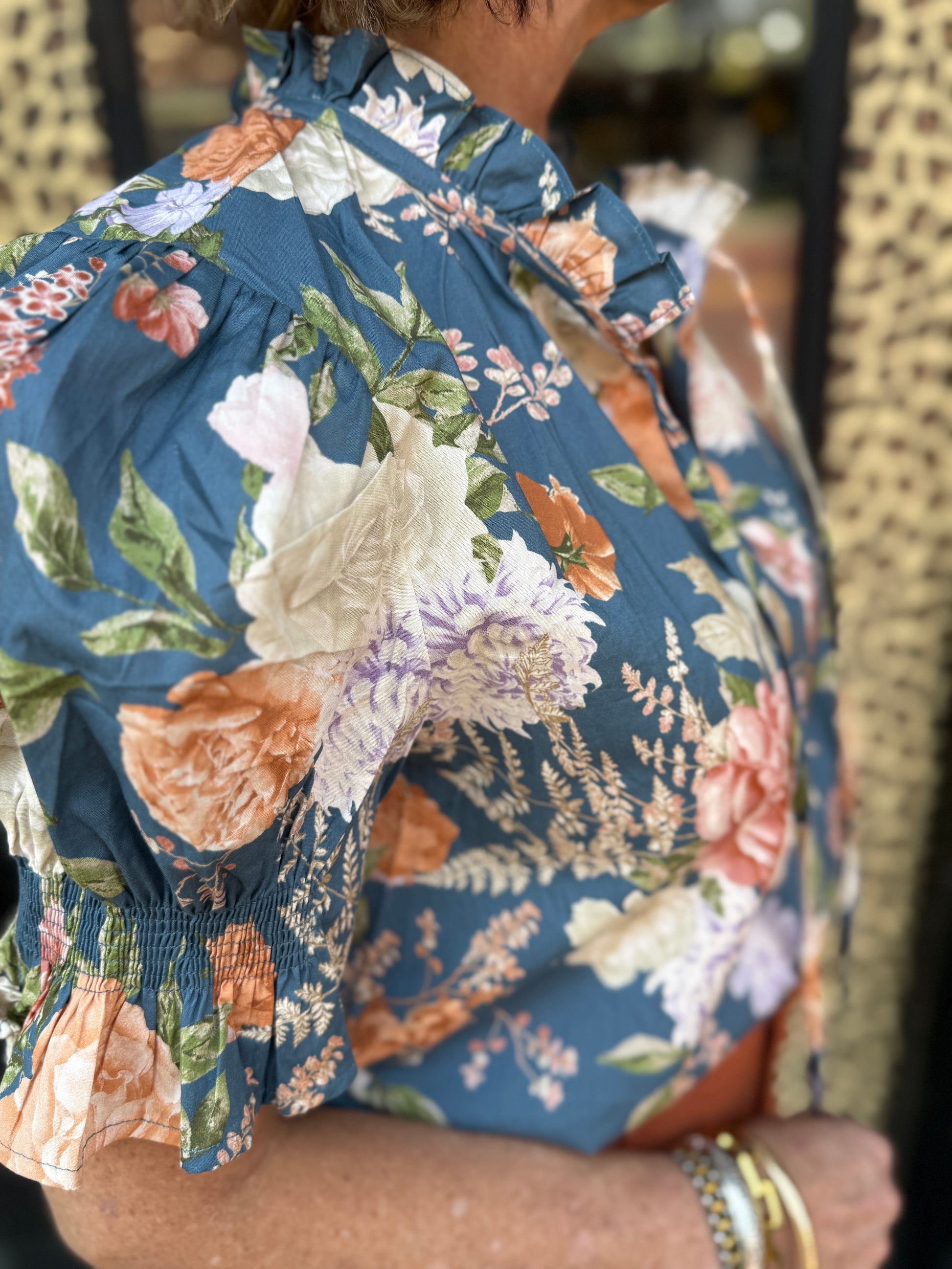 The Lisa Top features a delicate floral print with smocked detailing and short puff sleeves, offering a refined silhouette. Its lightweight woven fabric provides comfortable wear without sheerness, while the ruffle-finished V-neck adds an elegant touch. Unlined for a breathable feel, this top effortlessly blends sophistication with everyday ease.