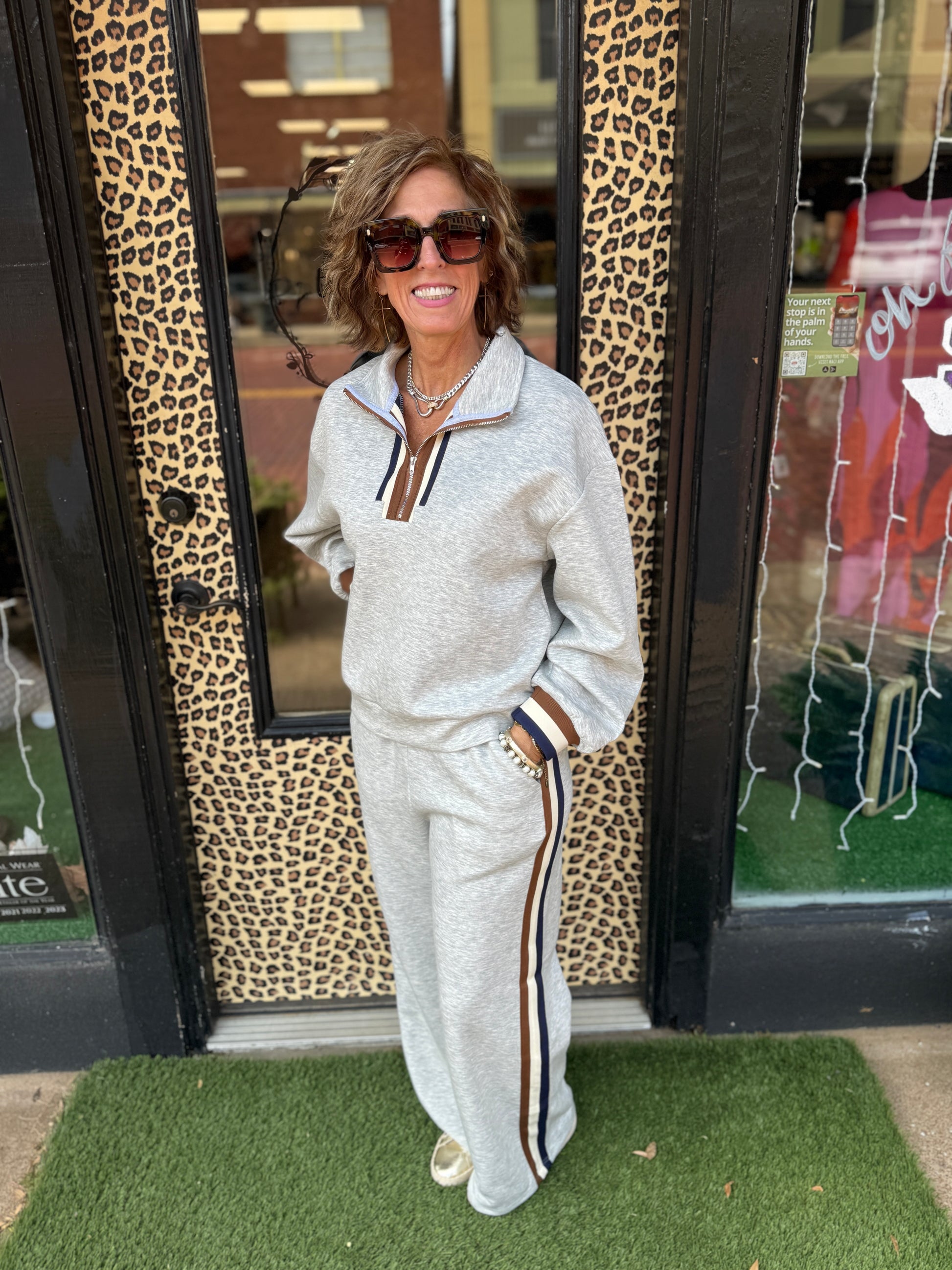 The Mia Set blends comfort and style effortlessly with its long-sleeve, front-zip sweatshirt featuring elegant colorblock trim detail. Complemented by solid sweatpants with a drawstring waist and side pockets, the subtle colorblock accents refine the silhouette. Perfect for elevated casual wear, this set offers both relaxed fit and polished appeal.
