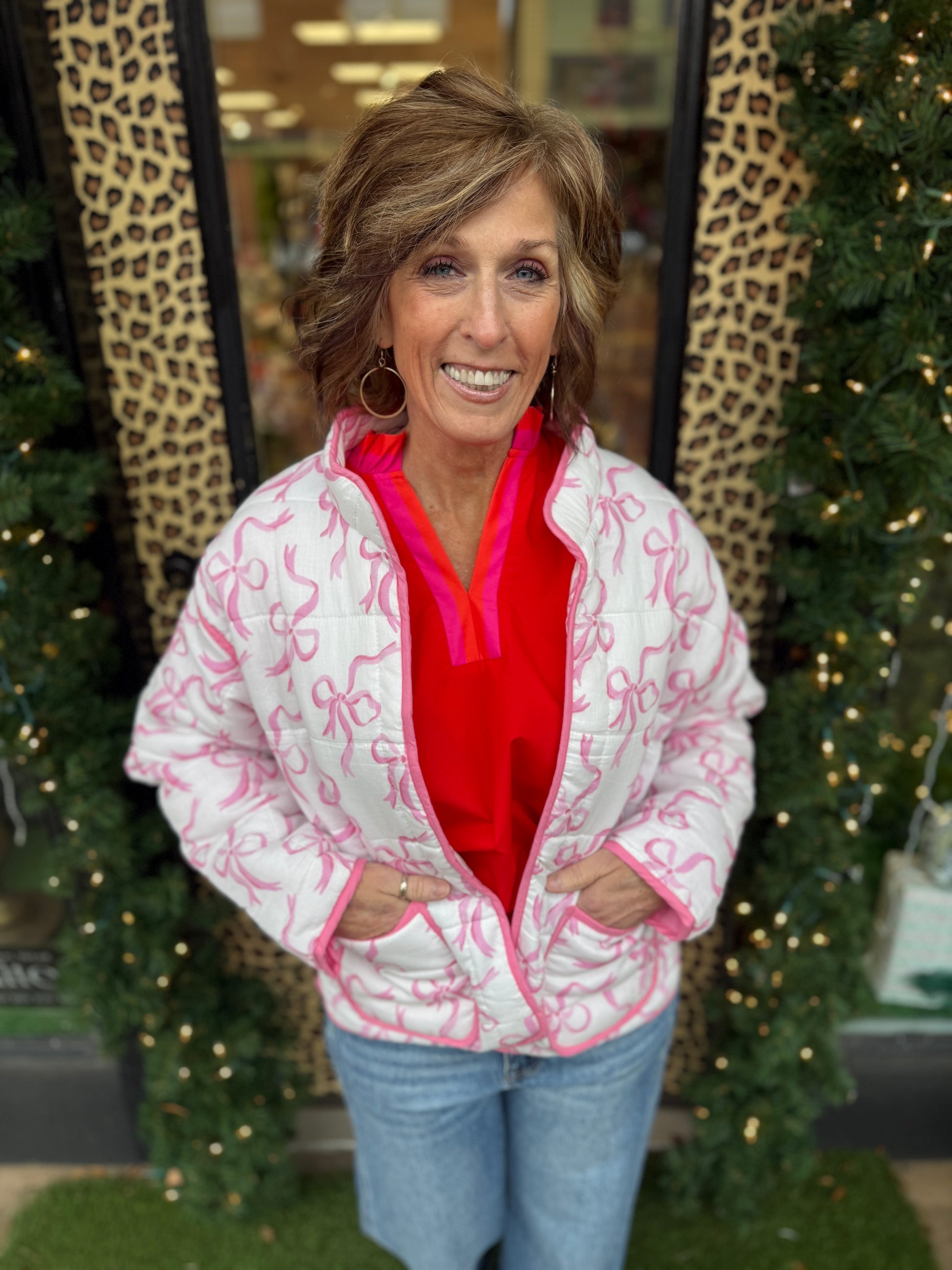 This charming white cotton quilted jacket, accented with a delicate pink bow, offers both style and comfort. Featuring a unique custom pattern, contrast piping, and lining, it adds a touch of elegance to any outfit. Large front pockets provide practical storage, making it a thoughtful and stylish gift for someone special.